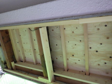 腐食した床・軒天を撤去し、新規下地を設置するための木工事。